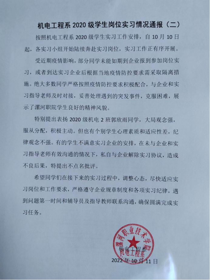 yl6809永利2020级员工岗位实习情况通报(二)