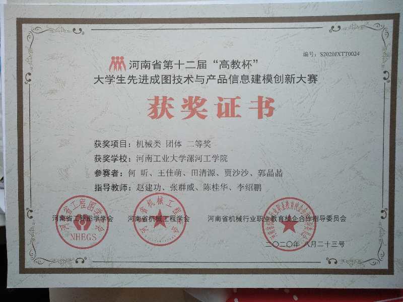 公司代表队何昕、王佳萌、田清源、贾莎莎、郭晶晶、陈志斌、朱文聪、吴鹏涛等8名员工在yl6809永利赵建功、李绍鹏、张群威、陈桂华等老师的指导下进行了比赛,取得了机械类团体二等奖的优异成绩。
