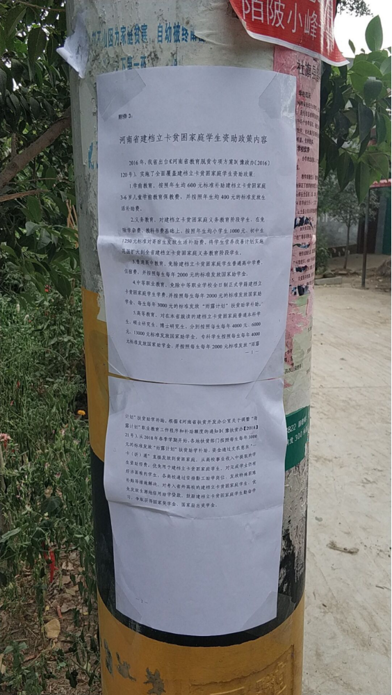 家住许昌市襄城县的刘部攀说:他把国家助学政策一览表贴在了他们村的很多电线杆上,经常能看到一些人看完之后在议论,还有些人直接拉着他问详细情况,他把自己接受国家资助的经历跟乡亲们讲了很多遍,街坊邻居都非常高兴国家有这些政策。